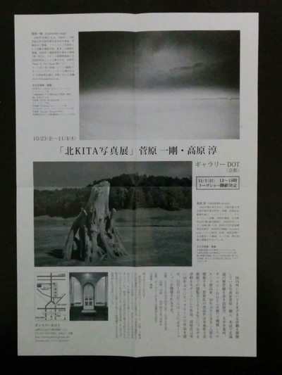 ギャラリーDOTにて 日々徒然 2015.10.282021.12.28 もう始まってますが…、下賀茂神社近くのギャラリーDOTで 「北 KITA写真展」 菅原一剛・高原淳2015年10月23日(金)~ 11月4日(水)休廊日:10月29日(木)open 12:00 ~ 19:00 やってます。 アナログとデジタル、モノクロの作品ですが見応えありましたよ。